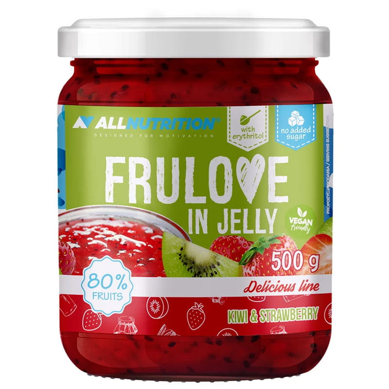 ALLNUTRITION Allnutrition In Jelly Kiwi & Strawberry to owocowa frużelina zawierająca kawałki kiwi i truskawek zanurzone w delikatnym żelu. Produkt idealnie nadaje się jako dodatek do deserów, naleśników, jogurtów czy owsianki. Nie zawiera dodatku cukru, co czyni go doskonałym wyborem dla osób dbających o zdrową dietę. Produkt jest słodzony erytrytolem.