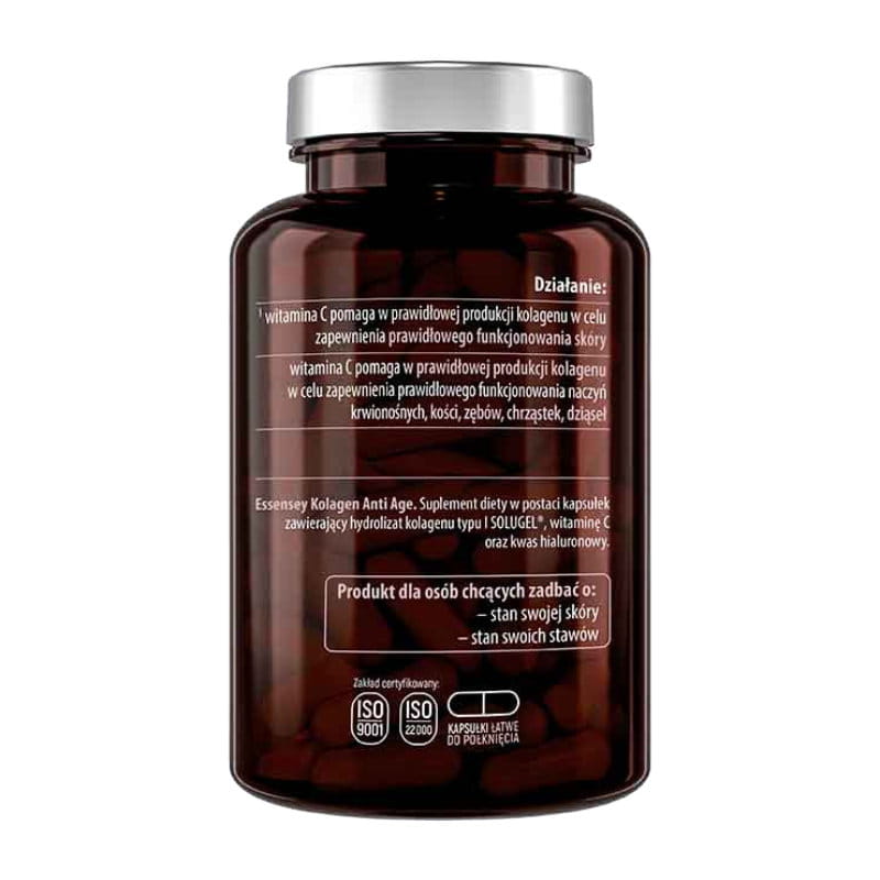 Kolagen Anti-Age w kapsułkach od Essensey to suplement diety, który wspiera zdrowie skóry, włosów i paznokci. Zawiera hydrolizowany kolagen, który wspomaga elastyczność skóry i działa przeciwstarzeniowo. Suplement jest przeznaczony dla osób chcących poprawić wygląd i zdrowie skóry oraz opóźnić efekty starzenia.