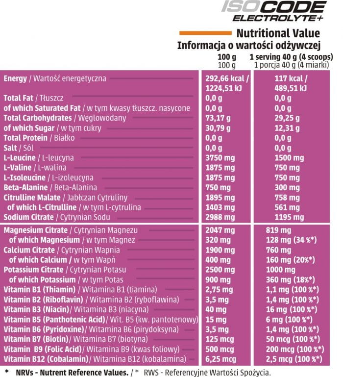 Maltodekstryna, fruktoza, izomaltuloza, L-leucyna, L-walina, L-izoleucyna, beta-alanina, jabłczan cytruliny, magnez (cytrynian magnezu), wapń (cytrynian wapnia), potas (cytrynian potasu), cytrynian sodu, amid kwasu nikotynowego (witamina B3), D-pantotenian wapnia (witamina B5), chlorowodorek pirydoksyny (witamina B6), ryboflawina (witamina B2), monoazotan tiaminy (witamina B1), kwas pteroilomonoglutaminowy (witamina B9), D-biotyna (witamina B7), cyjanokobalamina (witamina B12), regulator kwasowości: kwas cytrynowy, aromat, barwniki (w zależności od smaku i koloru produktu): brąz kakaowy, beta-karoten, czerwień buraczana, substancja słodząca: sukraloza.